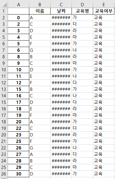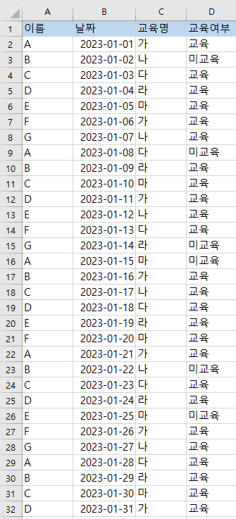 우선 가상의 데이터가 [사진1]과 같다고 하고, '교육여부'(D열)가 '미교육' 상태인 것을 삭제하는 것을 목표로 진행해보겠습니다.