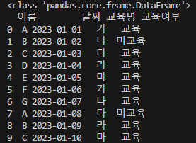 상단의 <class 'pandas.core.frame.DataFrame'>은 데이터 형태를 Pandas 형태로 잘 불러왔는지를 보여주는 출력 내용입니다.