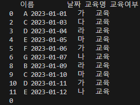 ('교육여부'가 '미교육'인 데이터 행 전체를 삭제 된 것을 볼 수 있고,
