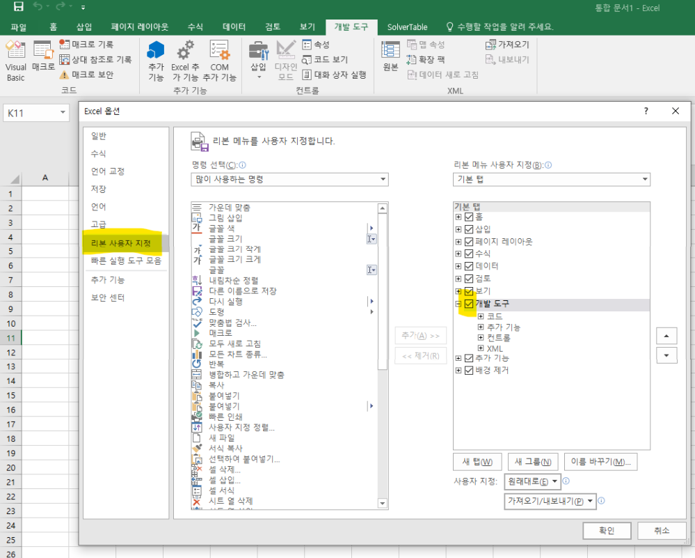 [사진2]의 노란 음영처럼 엑셀 상단의 '파일' - '옵션' 을 순서대로 클릭하면 나오는 화면에서 '리본 사용자 지정' - '개발 도구'의 체크 박스를 체크해주시고 '확인'을 누르시면 됩니다.