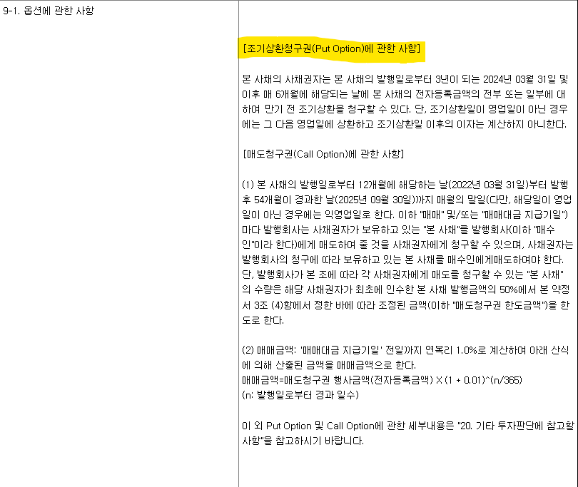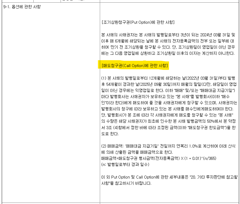 한편 콜옵션의 '(2) 매매금액'을 보면 연복리 1%를 가산하여 지급되는 것을 알 수 있는데, 이는 콜옵션을 실행하는 대신 사채권자에게 추가적으로 정해진 금액을 지불하는 개념으로 이해하시면 됩니다.