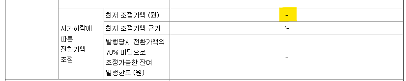 최저 전환가액이 정해져 있는 경우 전환가액 조정사유가 발생해도 현재 전환가액이 이미 최저 전환가액일 경우 추가적인 전환가액 수정은 이뤄지지 않습니다.