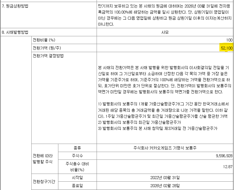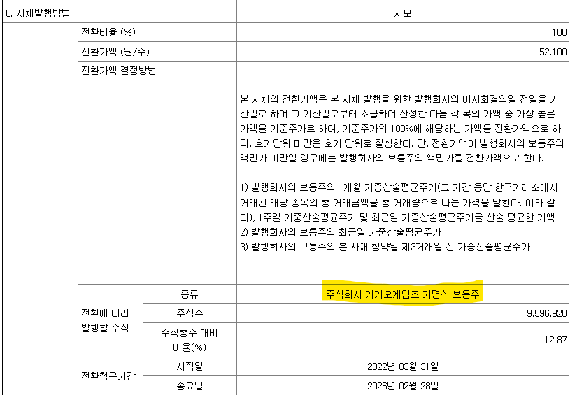 이번 사례 역시 카카오게임즈의 기명식 보통주를 전환주식으로 설정한 것을 알 수 있습니다.