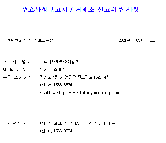 이번에 알아볼 케이스는 2021년 3월 26일에 공시된 카카오게임즈 회사의 제1회차 무기명 무이권부 무보증 사모 전환사채입니다.