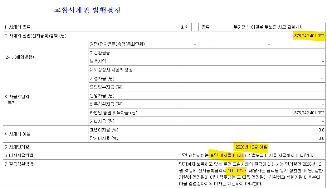 그리고 해당 교환사채를 발행한 내용에는 기본적인 채권의 성격과 함께(정해진 기간마다 이자지급 등)