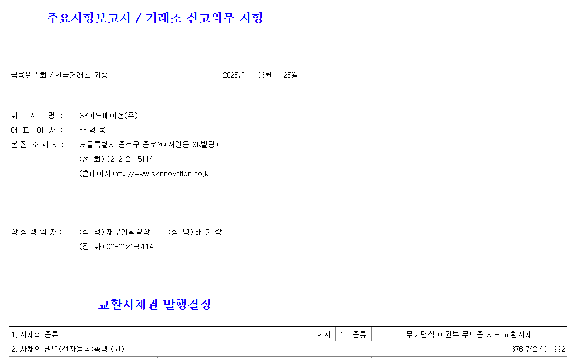 이번에 알아볼 케이스는 2025년 6월 25일에 공시된 SK이노베이션 회사의 제 1회차 무기명 무보증 사모 교환사채입니다.